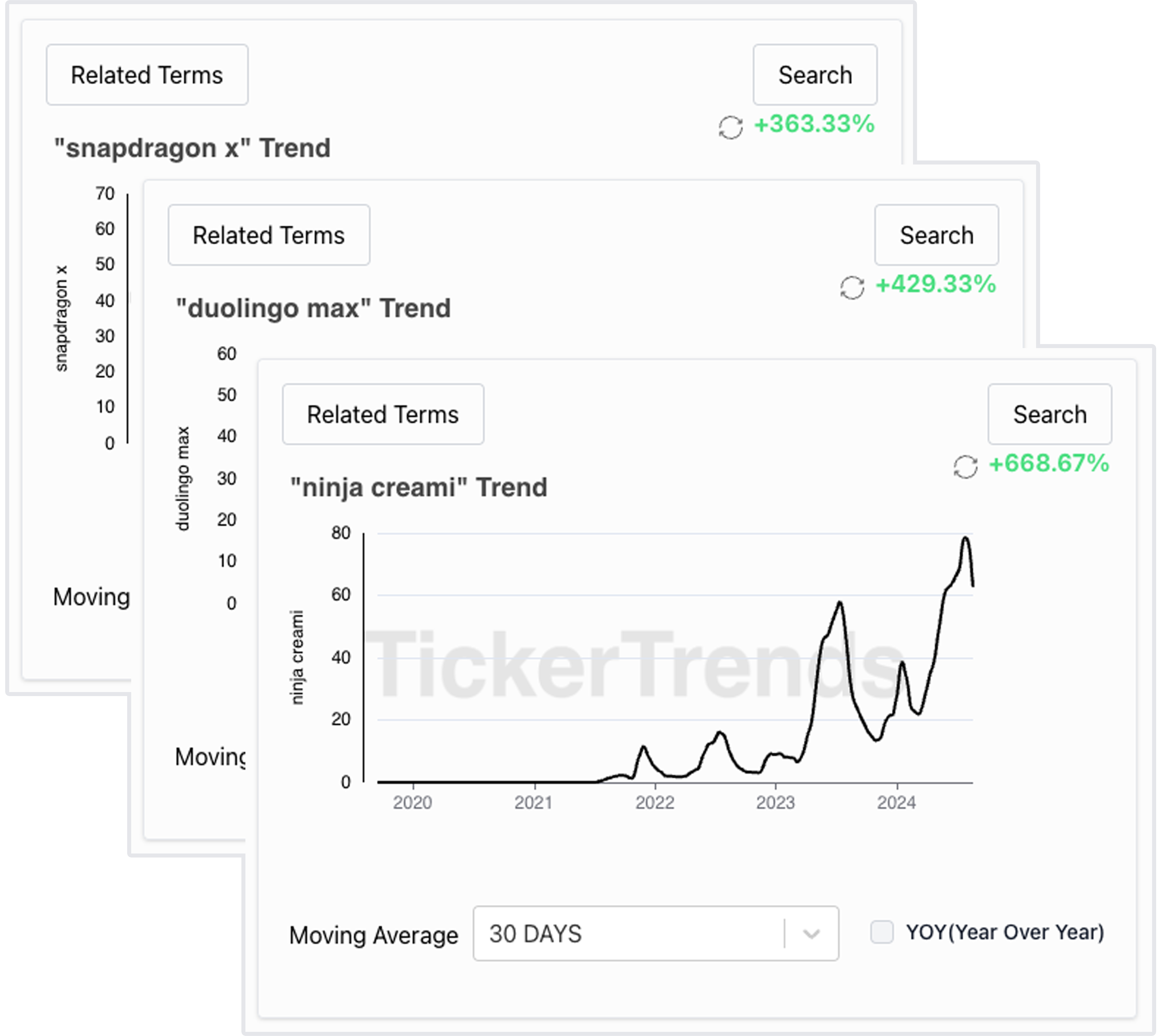TickerTrends forecasts are powered by a forward-looking model that captures consumer intent signals before the point of purchase. By analyzing real-time search behavior, product discovery patterns, and content engagement across the web, we identify demand trends well ahead of traditional data sources.